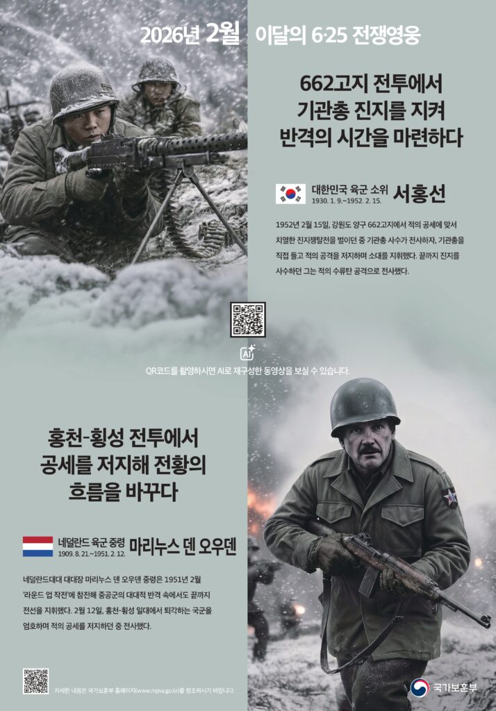 국가보훈부는 6·25전쟁 당시 대한민국 수호를 위해 공헌했던 서홍선 대한민국 육군 소위마리누스 덴 오우덴 육군 중령‘20262월 이달의 625전쟁영웅으로 선정했다